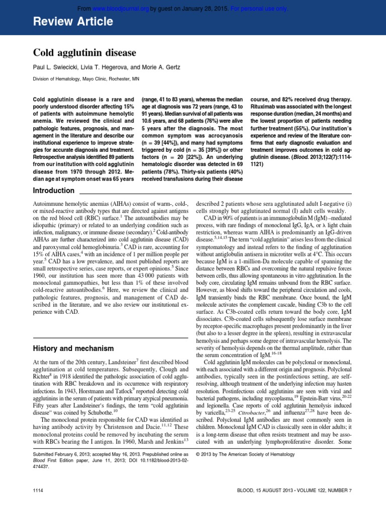 With CAD red blood cells clump together in blood vessels and. The pathophysiology is an IgM protein which can be monoclonal cold agglutinin disease or polyclonal usually post-infectious. In vivo immunoglobulin Ig M fixes complement molecules to the red cell membrane. We reviewed the clinical and pathologic features prognosis and management in the literature and describe our institutional experience to improve strategies for accurate diagnosis and treatment. Patients with CA but without evidence of cold hemagglutinin disease can safely undergo normothermic cardiopulmonary bypass at 37C and warm cardioplegia without further testing. The authors of the Mayo study noted that patients with cold hemagglutinin disease should undergo laboratory testing including cold agglutinin. Cold agglutinin disease is a form of direct extravascular antiglobulin-positive hemolysis. Participant eligibility includes age gender type and stage of disease and previous treatments or health concerns. Cold agglutinin disease is a rare and poorly understood disorder affecting 15 of patients with autoimmune hemolytic anemia.