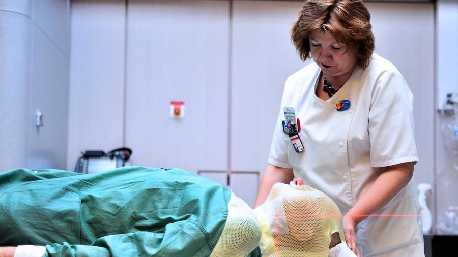 Der Kopf des Patienten ist dabei in einem Rahmen fixiert.