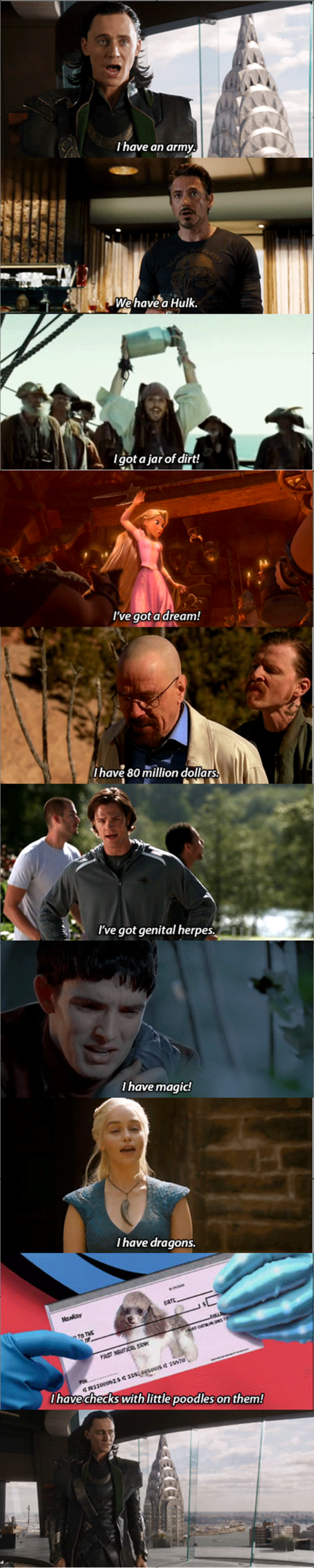 Origin The first use of this phase was used in the 2012 film the Avengers when the villain Loki is arguing with Tony Stark before the start of the final battle. I have an army e have a Liberty Prime I have a settlement. - Harrow Trumps Everything.